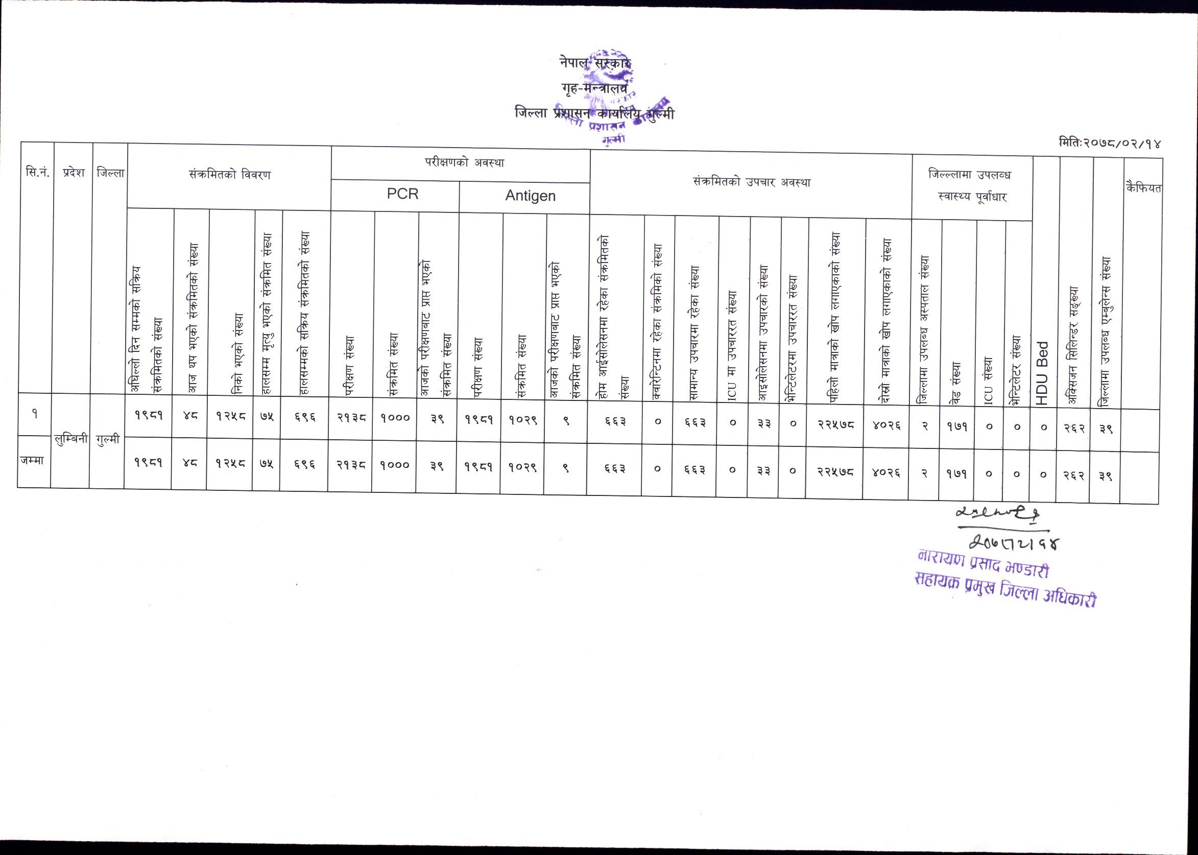 मिति २०७८।०५।२३ कोभिड-१९ को गुल्मी जिल्लाको संक्षिप्त विवरण ।