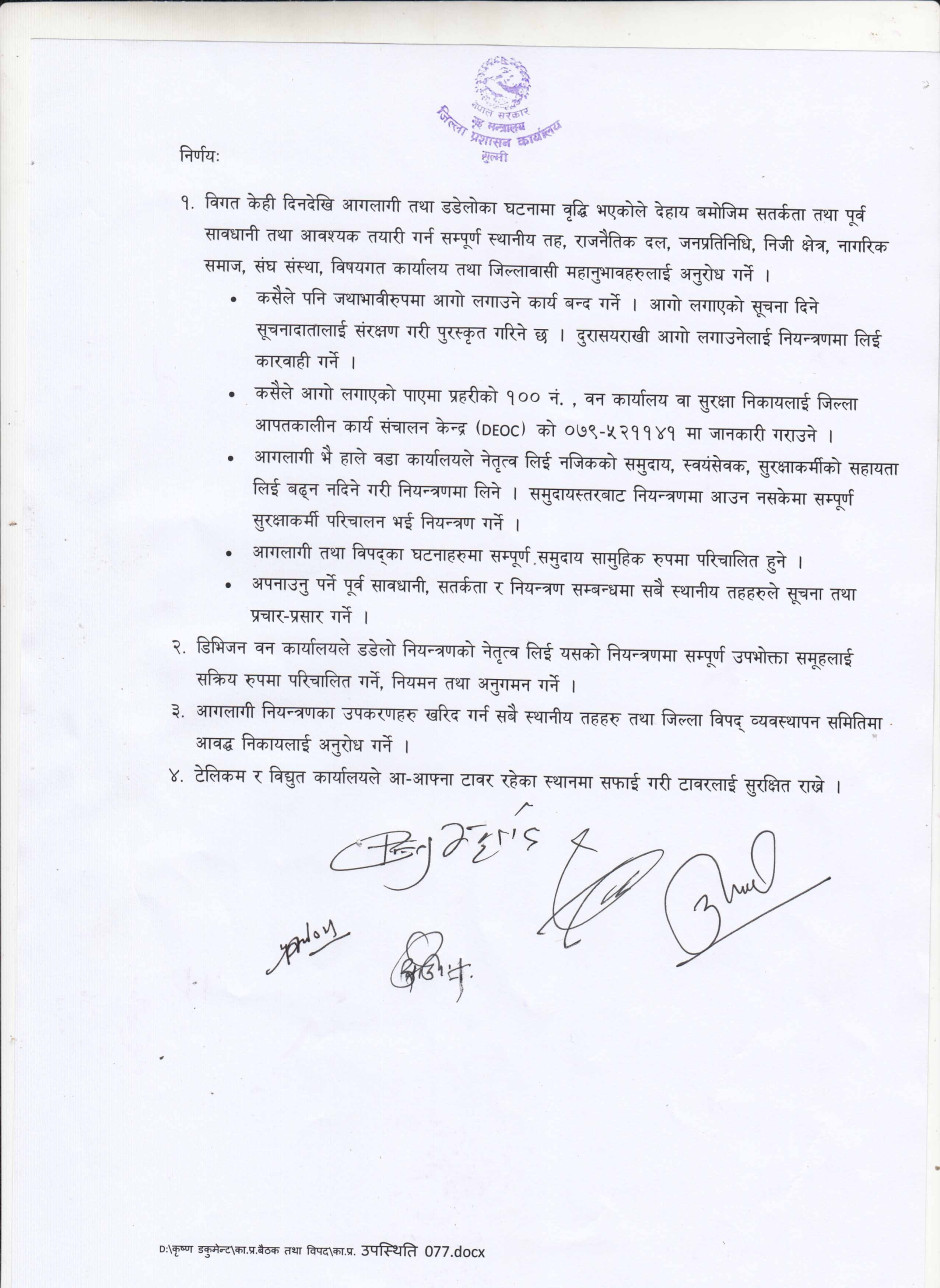 आगलागी नियन्त्रण सम्बन्धी मिति २०७७।१२।३० गतेकाे बैठककाे निर्णय