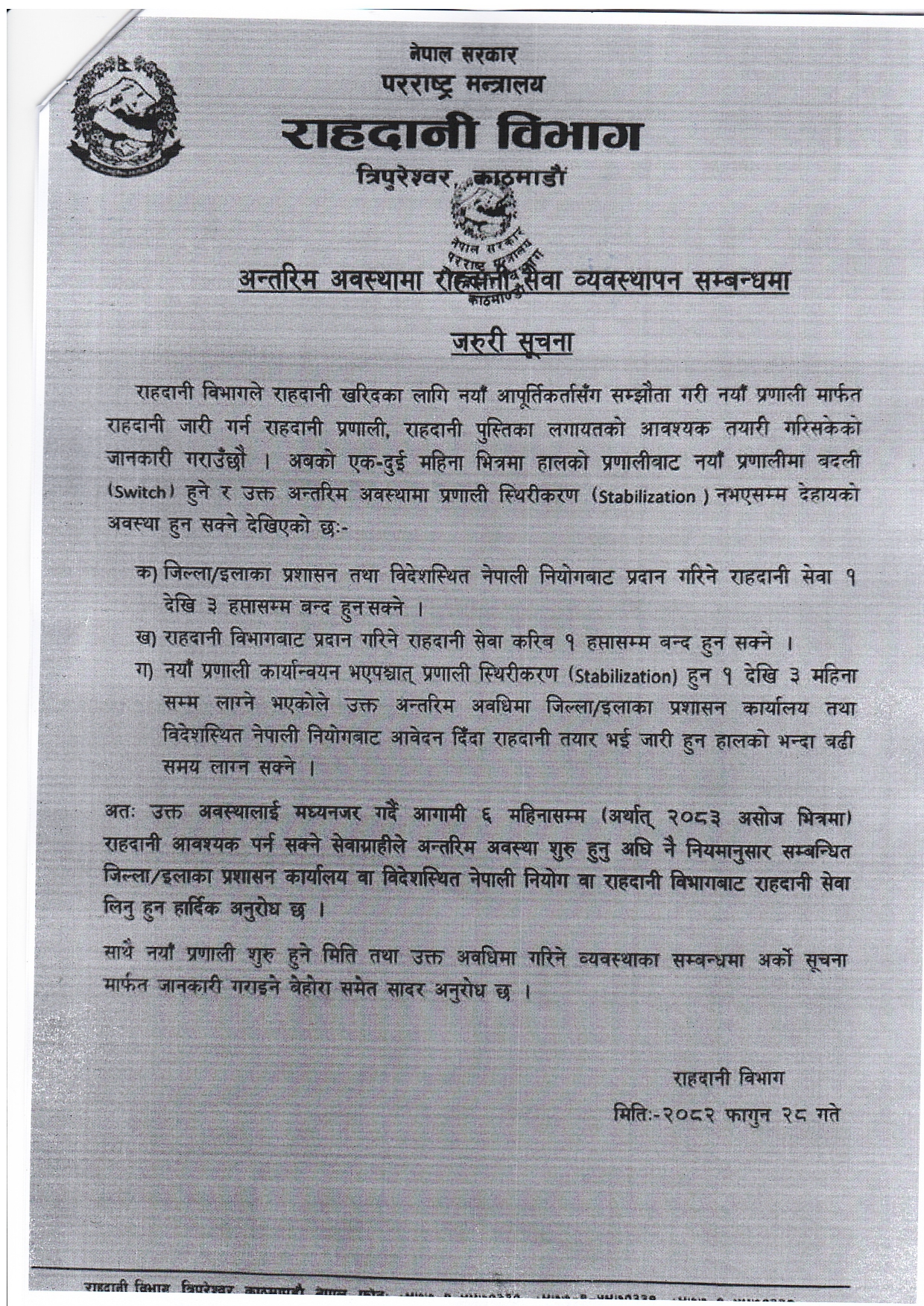 अन्तरिम अवस्थामा राहदानी सेवा व्यवस्थापन सम्बन्धमा।