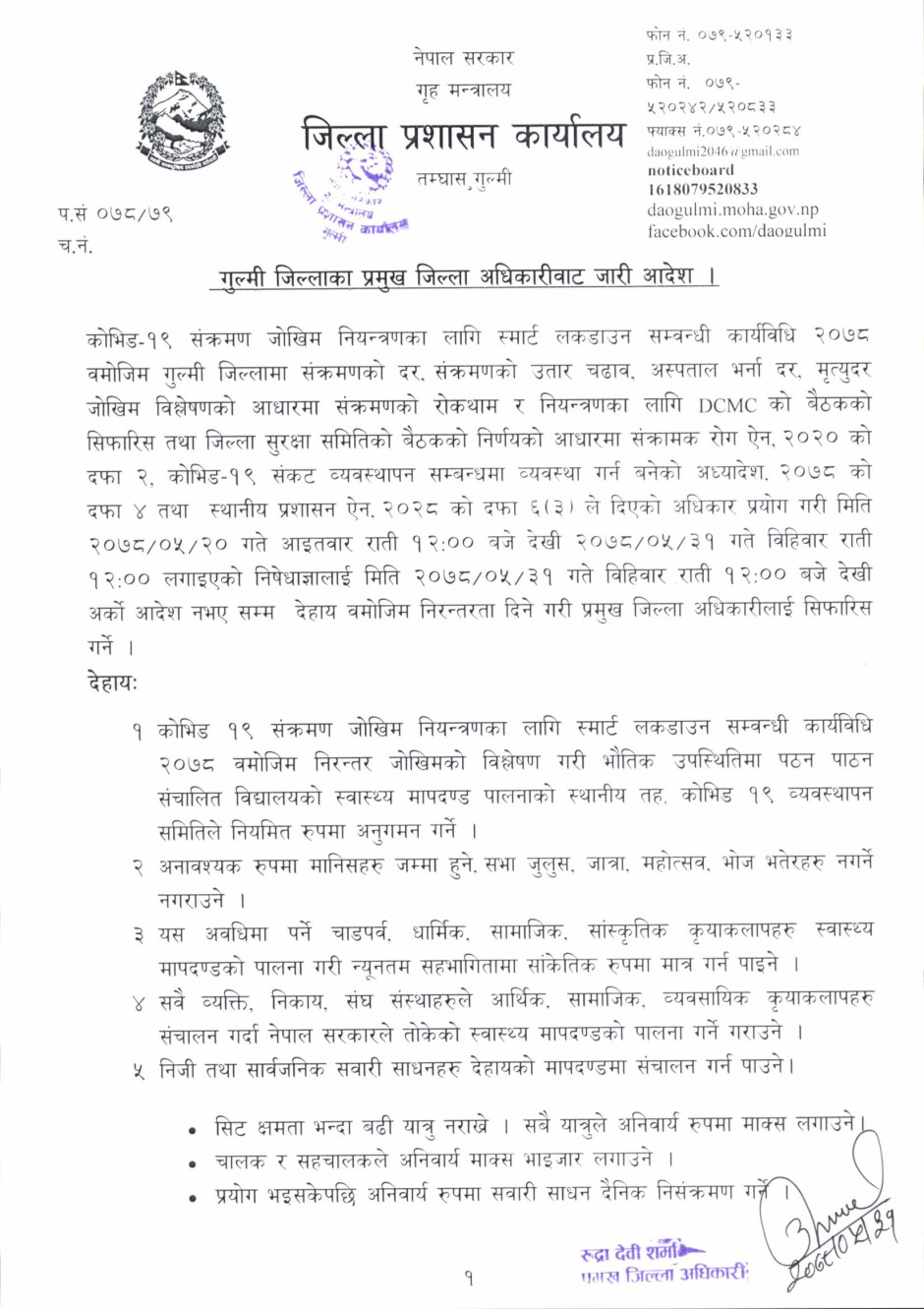 तस्बिर : गुल्मी जिल्लाका प्रमुख जिल्ला अधिकारीबाट जारी भएको आदेश ।