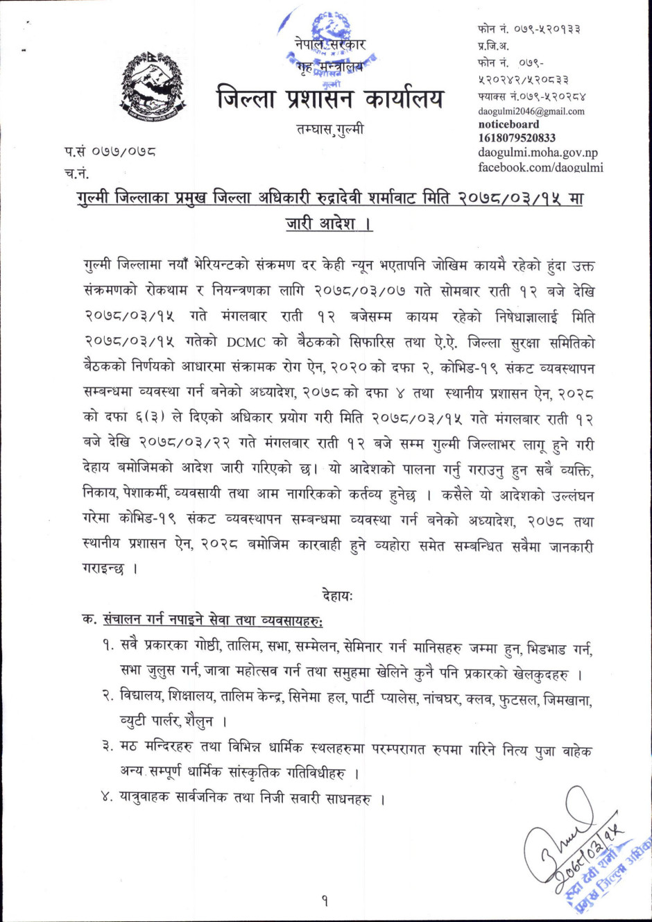 गुल्मी जिल्लाका प्रमुख जिल्ला अधिकारी रुद्रादेवी शर्माबाट मिति २०७८।०३।१५ मा जारी आदेश ।