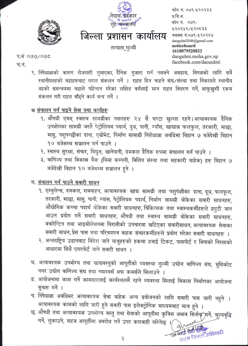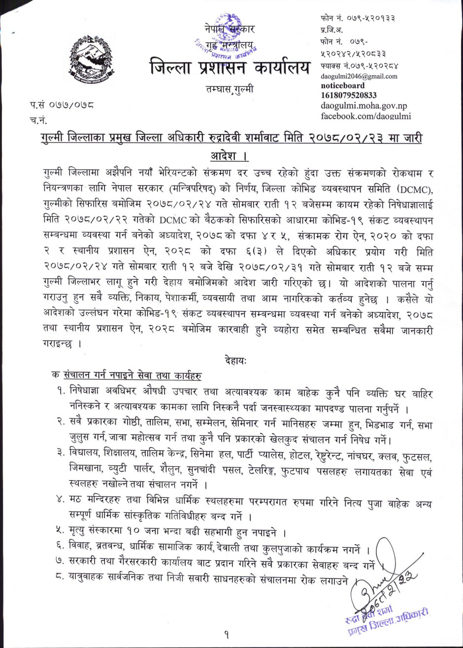 गुल्मी जिल्लाका प्रमुख जिल्ला अधिकारी रुद्रादेेवी शर्मावाट मिति २०७८-०२-२३ मा जारी आदेश