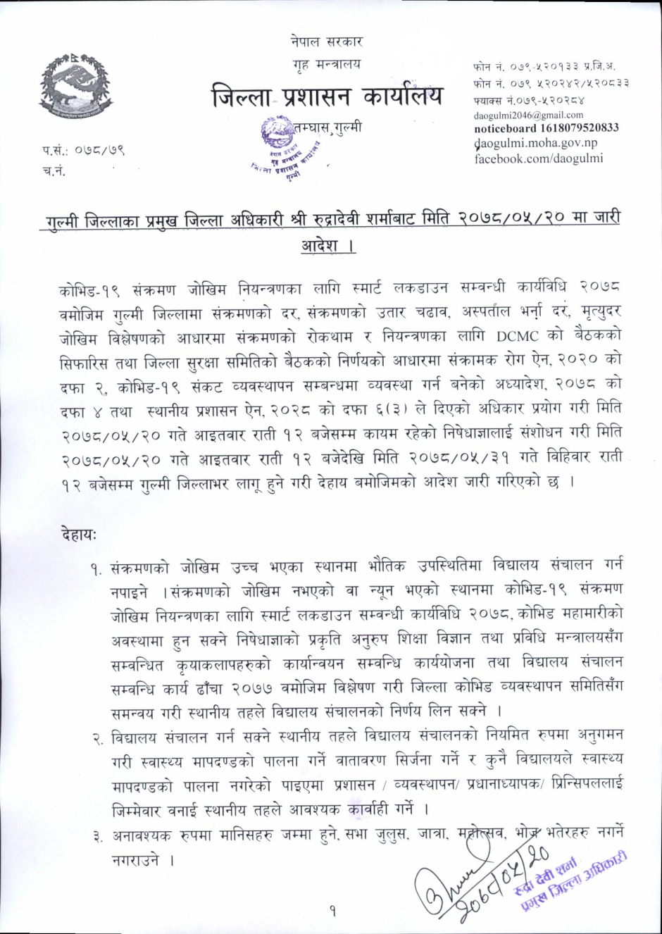 गुल्मी जिल्लाका प्रमुख जिल्ला अधिकारी श्री रुद्रादेवी शर्माज्यूबाट मिति २०७८।०५।२० गते जारी भएको आदेश ।