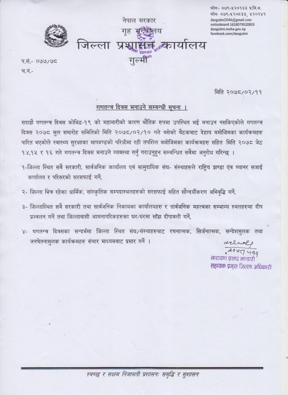 गणतन्त्र दिवस २०७८ मनाउने सम्बन्धी सूचना ।