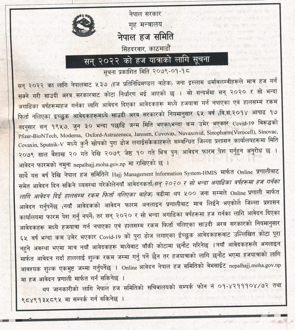 हज यात्राकाे लागि आवेदन दिने सम्बन्धी सूचना