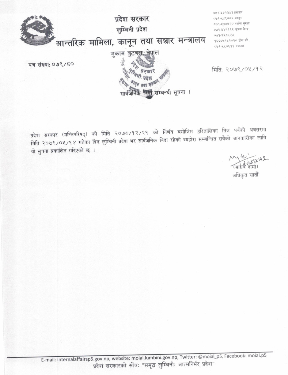 हरितालिका तिज पर्व २०७९ को अवसरमा सार्वजनिक विदा सम्बन्धी सुचना