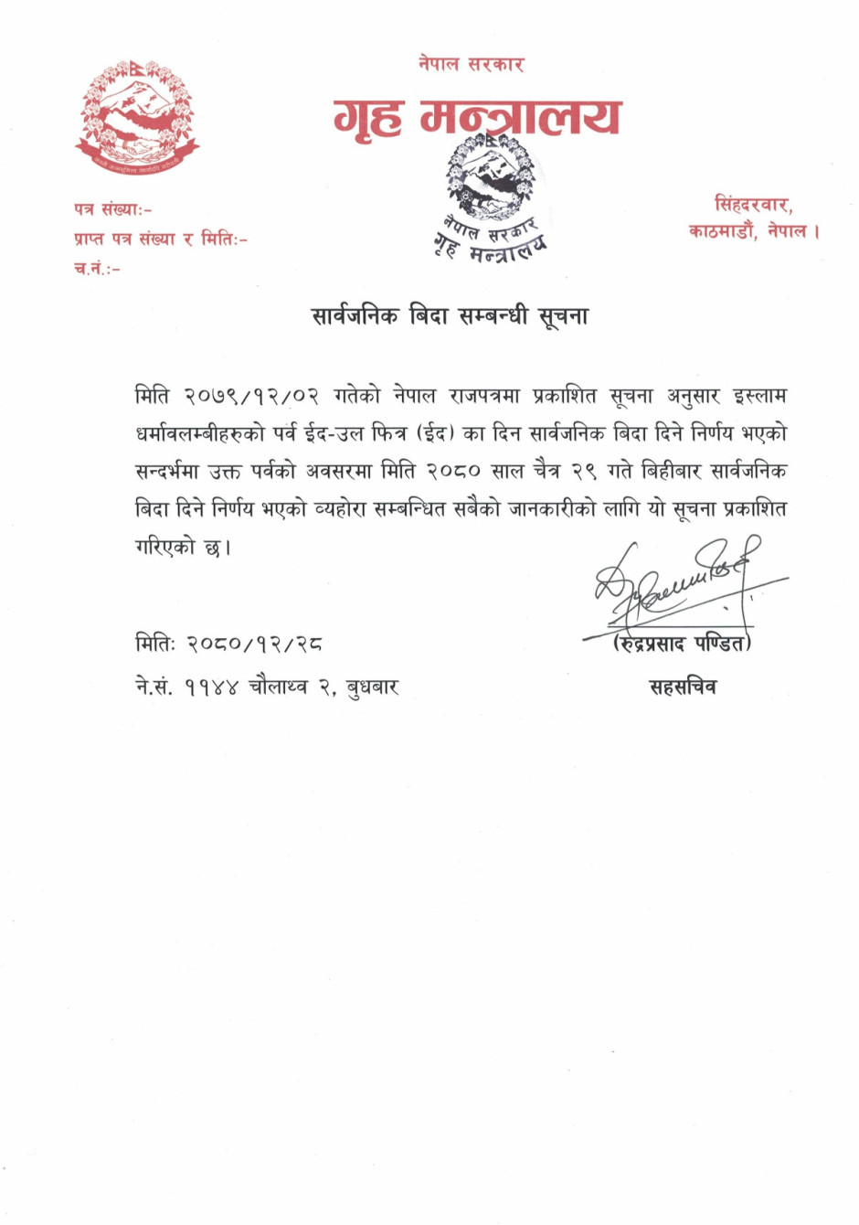 ईद-उल फित्र (ईद) को दिन सार्वजनिक बिदा सम्बन्धमा