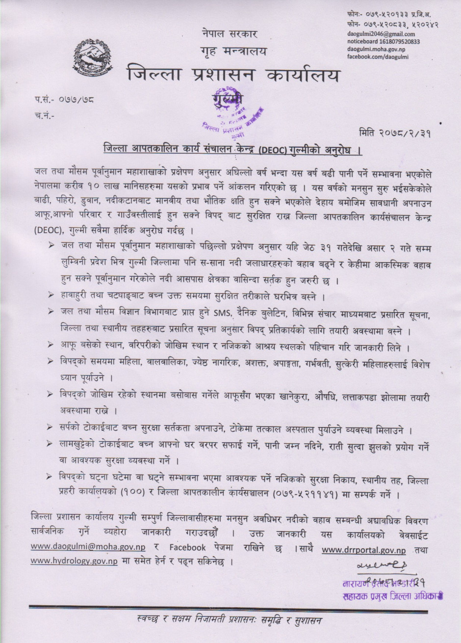 जिल्ला आपतकालिन कार्य संचालन केन्द्र (DEOC) गुल्मीको अनुरोध ।