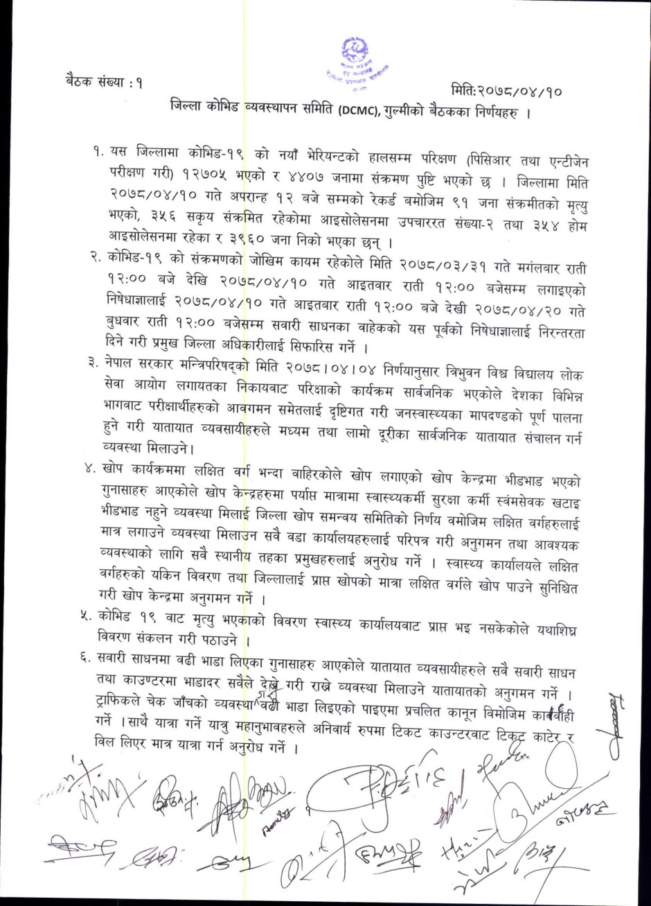 जिल्ला कोभिड व्यवस्थापन समिति (DCMC),गुल्मीको बैठकका निर्णयहरु ।