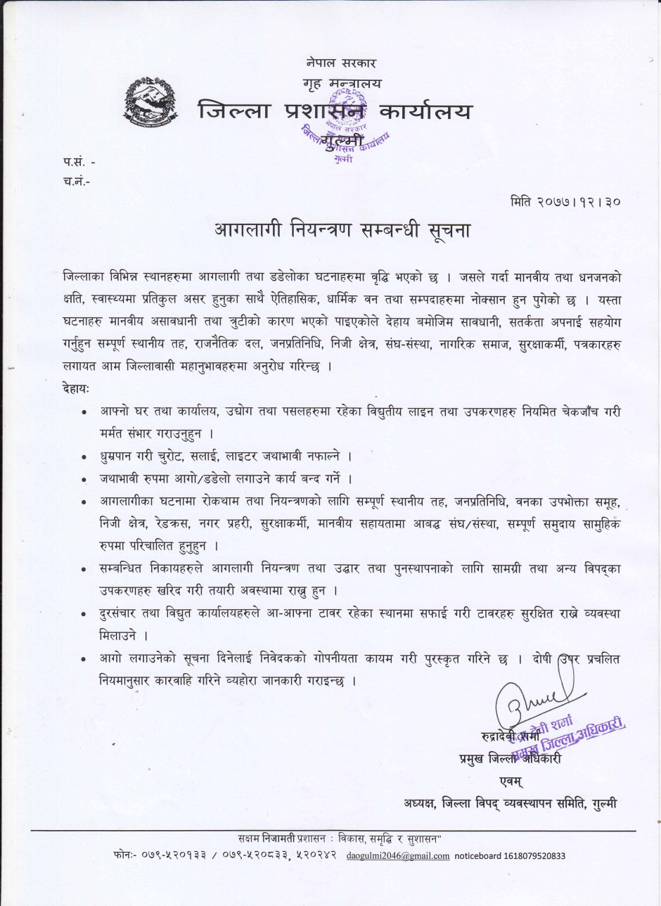 जिल्लाका विभिन्न स्थानहरुमा देखिएको आगलागी नियन्त्रण सम्बन्धी मिति २०७७।१२।३० को सूचना
