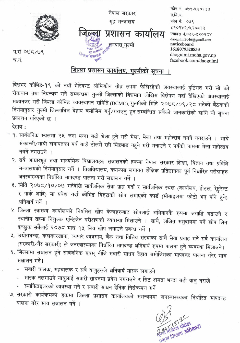 जिल्ला प्रशासन कार्यालय गुल्मीबाट मिति २०७८-९-२८ मा जारी सूचना ।