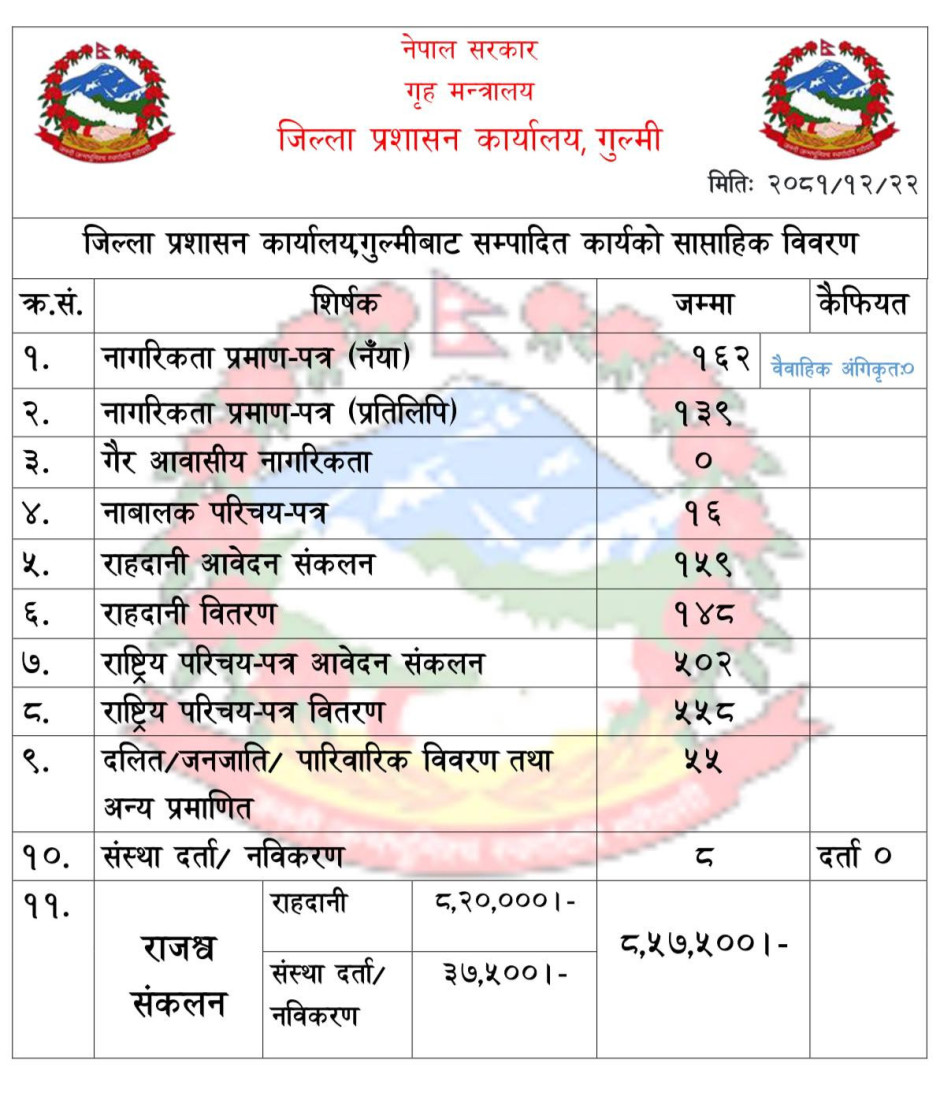 जिल्ला प्रशासन कार्यालय,गुल्मीबाट सम्पादित कार्यको साप्ताहिक विवरण।