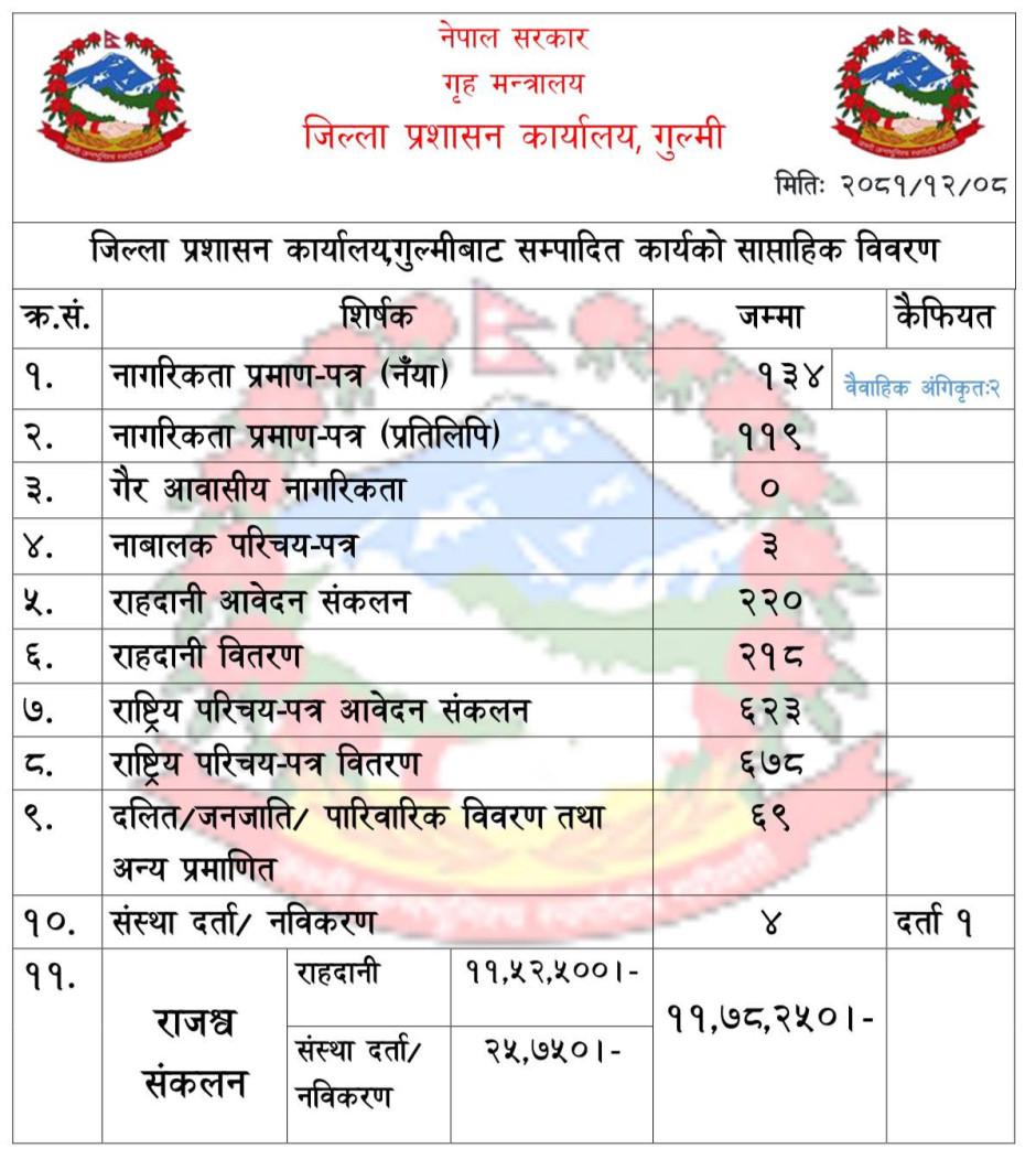 जिल्ला प्रशासन कार्यालय,गुल्मीबाट सम्पादित कार्यको साप्ताहिक विवरण।