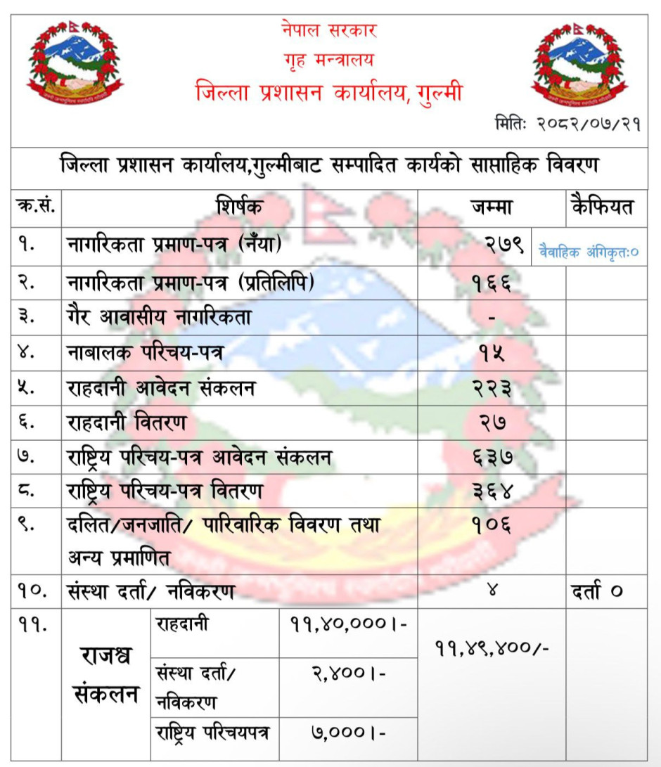 जिल्ला प्रशासन कार्यालय,गुल्मीबाट सम्पादित कार्यको साप्ताहिक विवरण।(२०८२-०७-१६ देखी २१)