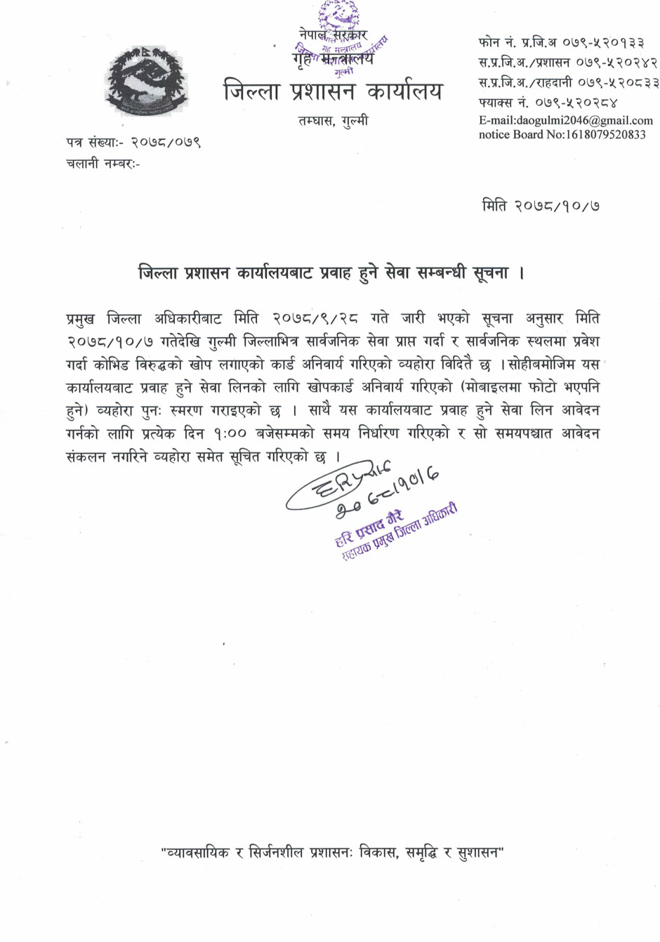 जिल्ला प्रशासन कार्यालयबाट प्रवाह हुने सेवा प्रवाह सम्बन्धी सूचना ।