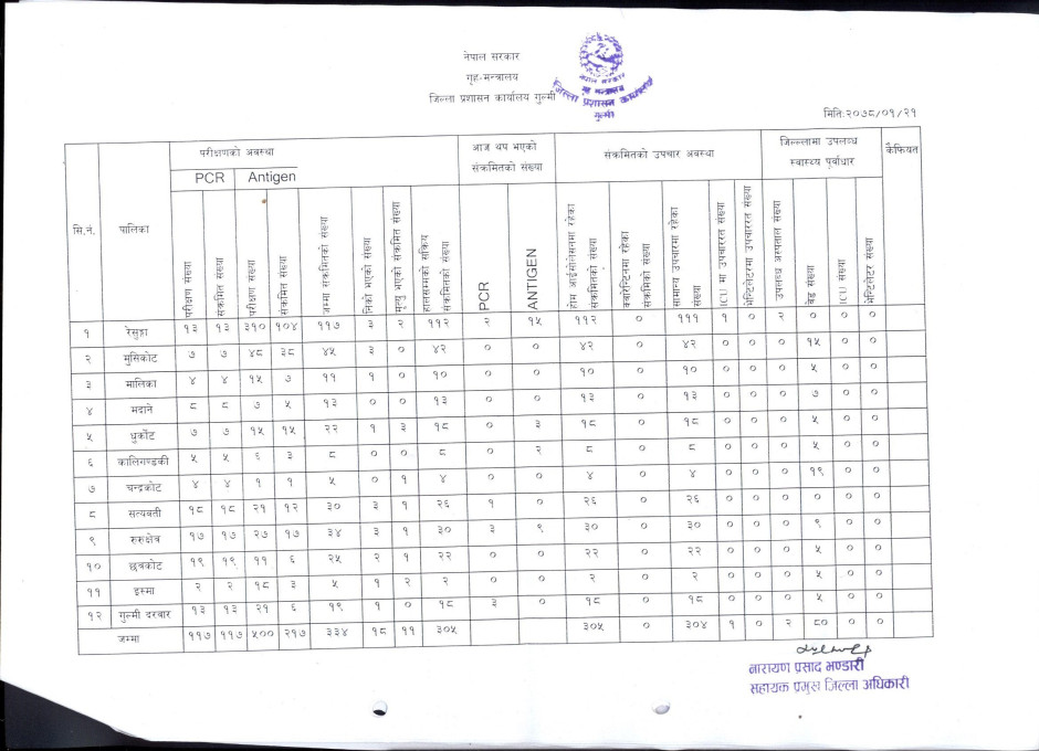 २०७८/०१/२१ कोभिड-१९ सम्बन्धी गुल्मी जिल्लाको संक्षिप्त विवरण