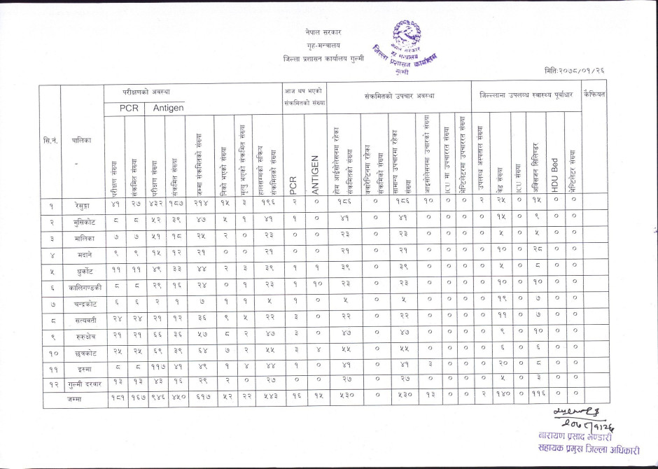 २०७८/०१/२६ कोभिड-१९ सम्बन्धी गुल्मी जिल्लाको संक्षिप्त विवरण ।