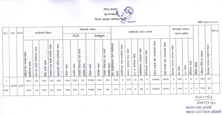 २०७८।०१। ३० कोभिड-१९ सम्बन्धी गुल्मी जिल्लाको संक्षिप्त विवरण ।