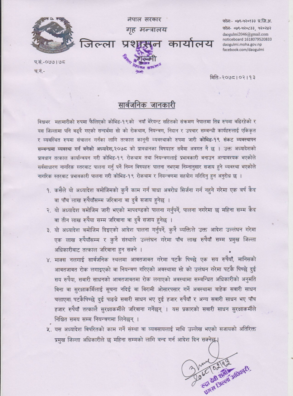 मिति २०७८/२/१३ गते प्रमुख जिल्ला अधिकारी बाट जारी भएको सार्वजानिक जानकारी ।