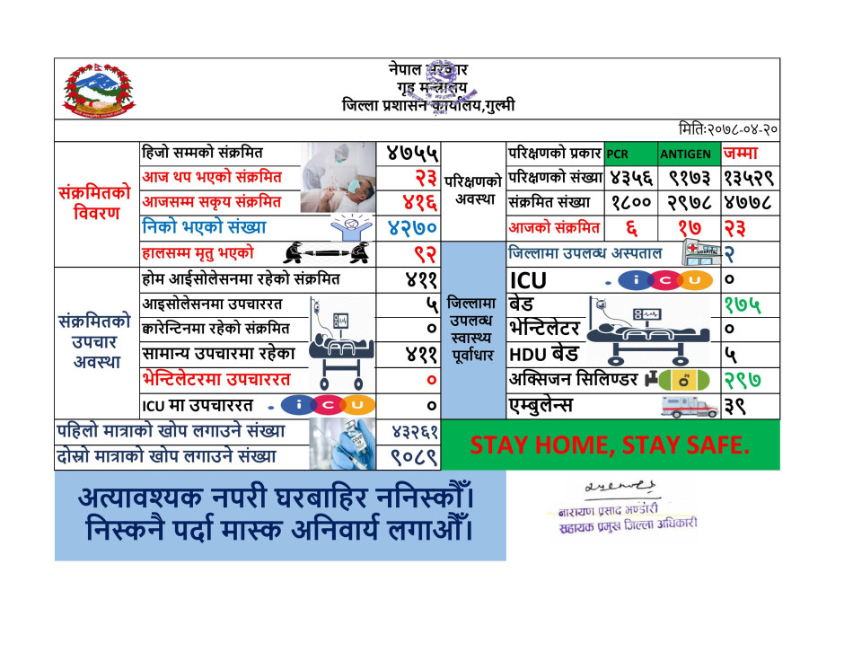 मिति २०७८।०४।२० कोभिड-१९ को गुल्मी जिल्लाको संक्षिप्त विवरण ।