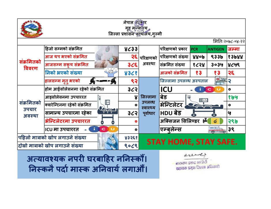 मिति २०७८।०४।२२ कोभिड-१९ को गुल्मी जिल्लाको संक्षिप्त विवरण ।