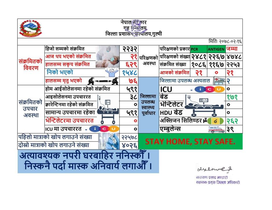 तस्बिर : मिति २०७८। ०२।१६ कोभिड-१९ को गुल्मी जिल्लाको संक्षिप्त विवरण ।