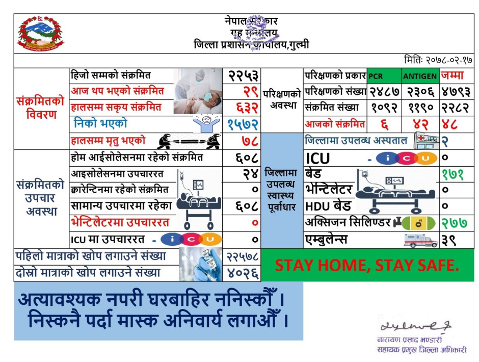 तस्बिर : मिति २०७८। ०२।१७ कोभिड-१९ को गुल्मी जिल्लाको संक्षिप्त विवरण ।