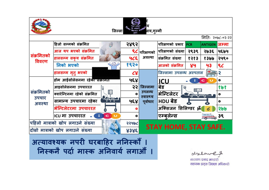 मिति २०७८। ०२।२२ कोभिड-१९ को गुल्मी जिल्लाको संक्षिप्त विवरण ।