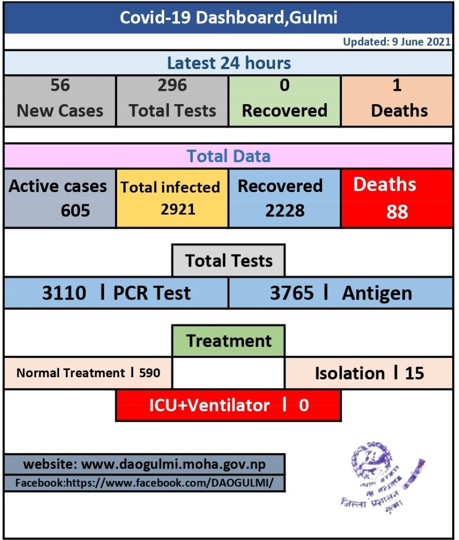 मिति २०७८। ०२।२७ कोभिड-१९ को गुल्मी जिल्लाको संक्षिप्त विवरण ।