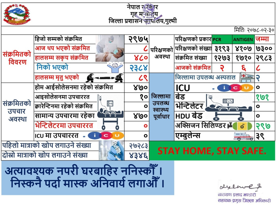 तस्बिर : मिति २०७८। ०२।३० कोभिड-१९ को गुल्मी जिल्लाको संक्षिप्त विवरण ।
