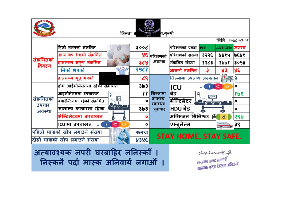 मिति २०७८। ०३।०१ कोभिड-१९ को गुल्मी जिल्लाको संक्षिप्त विवरण ।