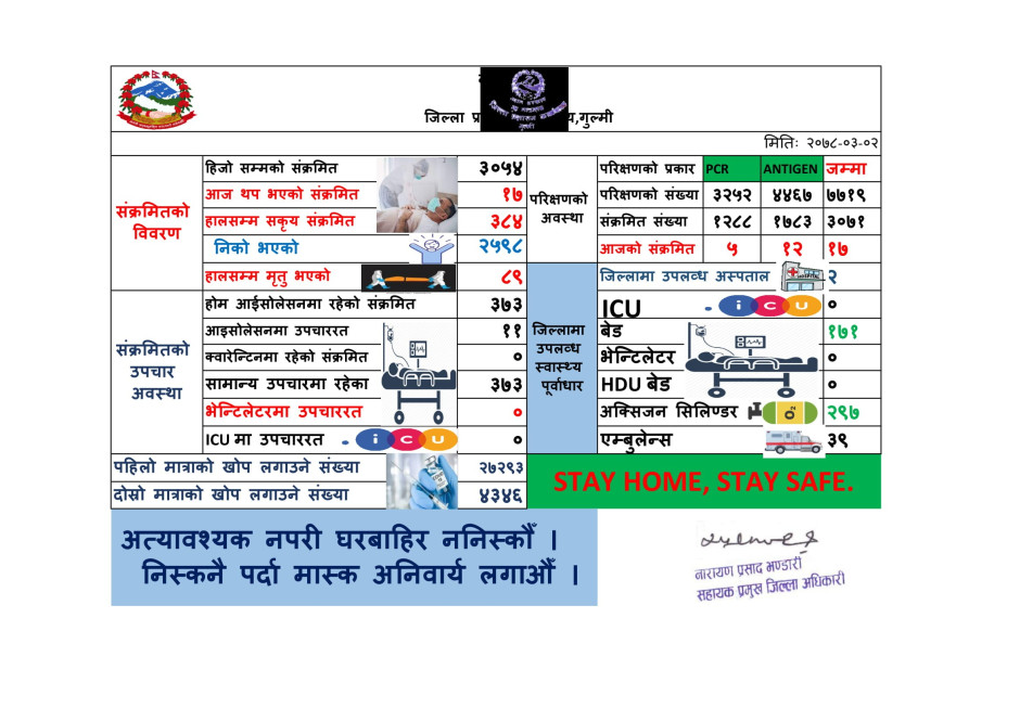 मिति २०७८। ०३।०२ कोभिड-१९ को गुल्मी जिल्लाको संक्षिप्त विवरण ।