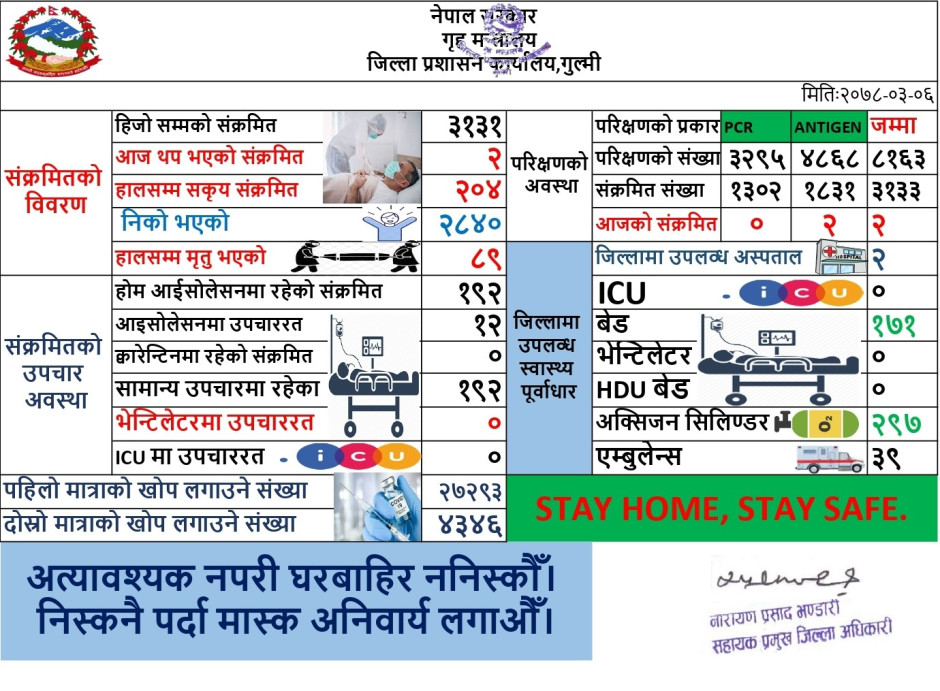 मिति २०७८। ०३।०६ कोभिड-१९ को गुल्मी जिल्लाको संक्षिप्त विवरण ।