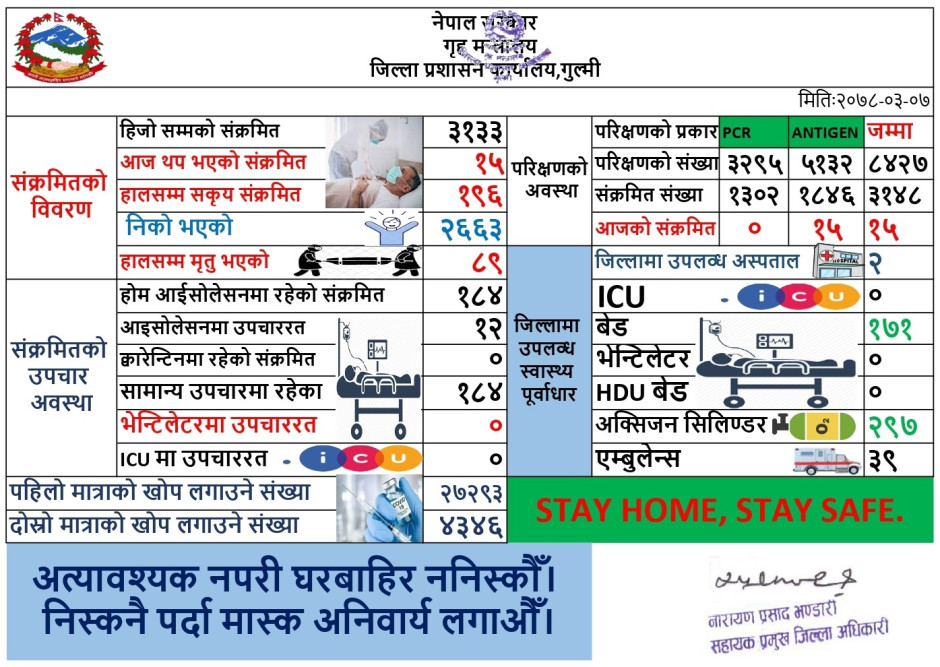 मिति २०७८।०३।१५ कोभिड-१९ को गुल्मी जिल्लाको संक्षिप्त विवरण ।