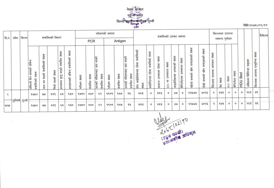 मिति २०७८। ०२।१० कोभिड-१९ को गुल्मी जिल्लाको संक्षिप्त विवरण ।