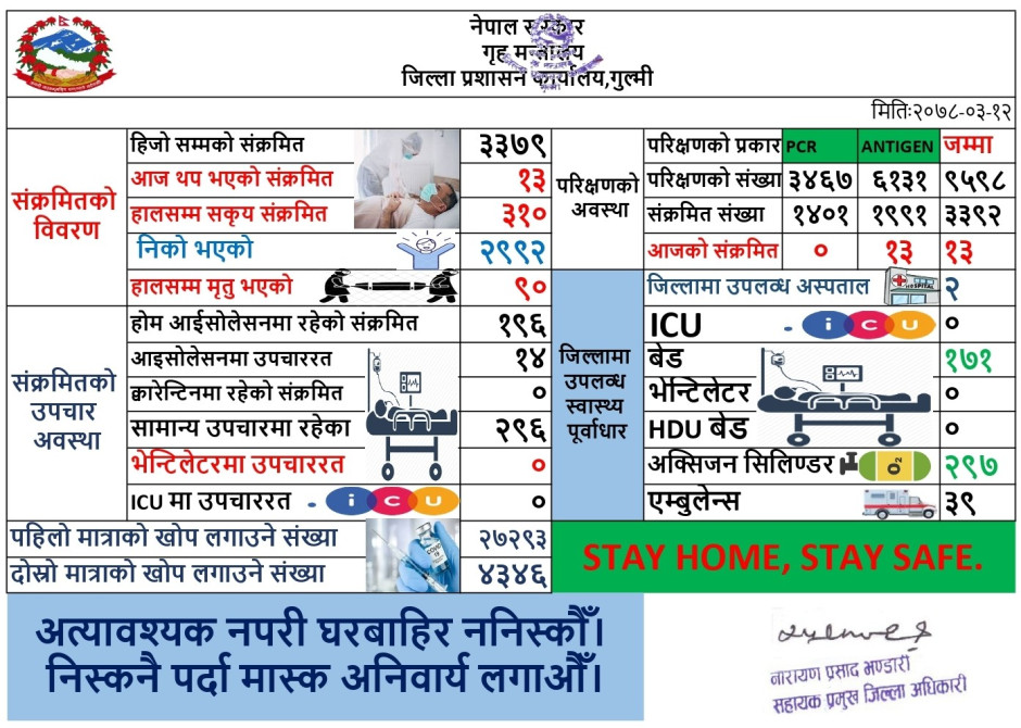तस्बिर : मिति २०७८।०३।१२ कोभिड-१९ को गुल्मी जिल्लाको संक्षिप्त विवरण ।