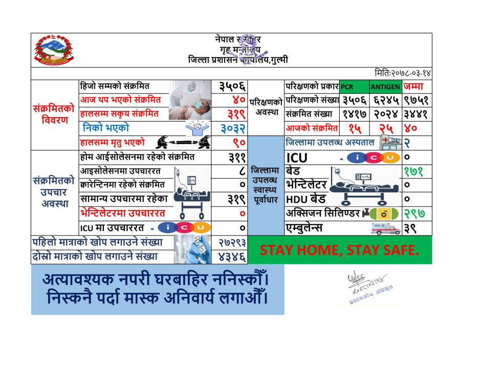 मिति २०७८।०३।१४ कोभिड-१९ को गुल्मी जिल्लाको संक्षिप्त विवरण ।