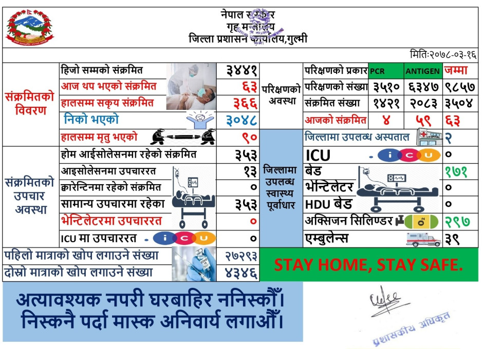 तस्बिर : मिति २०७८।०३।१५ कोभिड-१९ को गुल्मी जिल्लाको संक्षिप्त विवरण ।