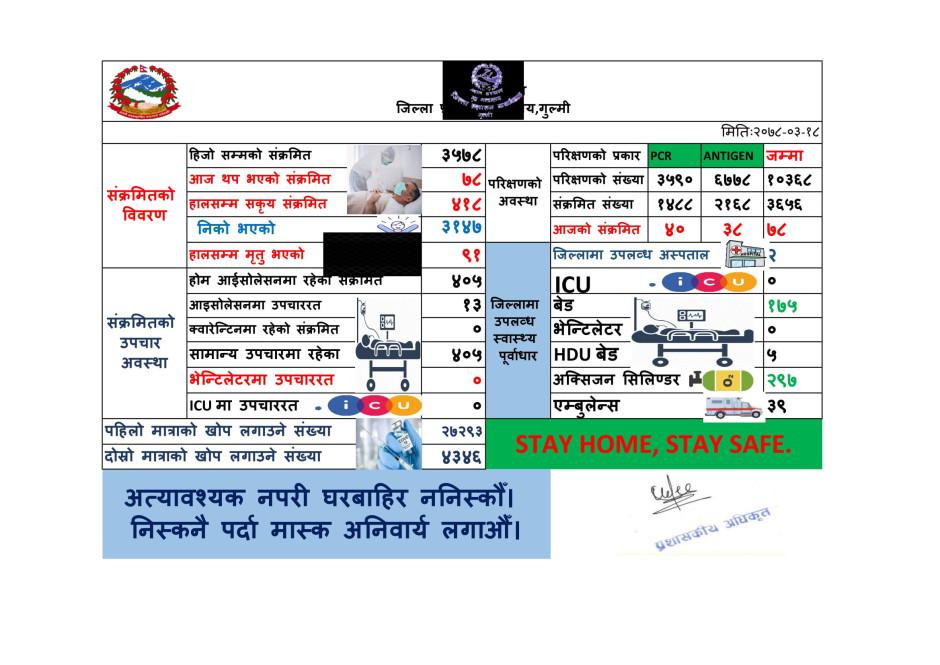 मिति २०७८।०३।१८ कोभिड-१९ को गुल्मी जिल्लाको संक्षिप्त विवरण ।