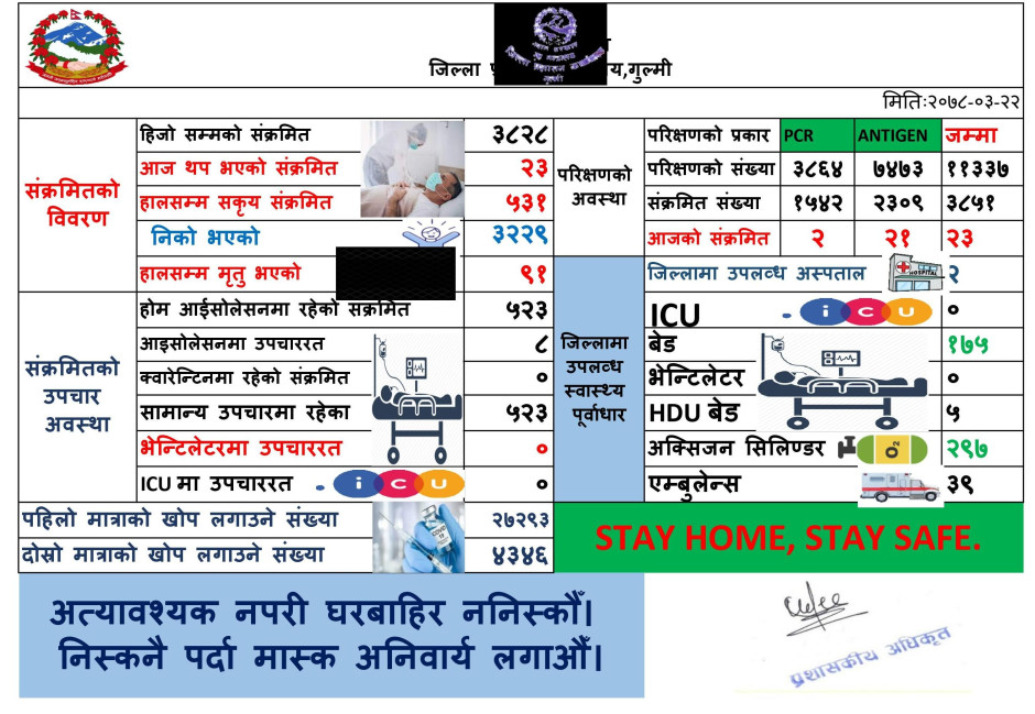 मिति २०७८।०३/२२ कोभिड-१९ को गुल्मी जिल्लाको संक्षिप्त विवरण ।