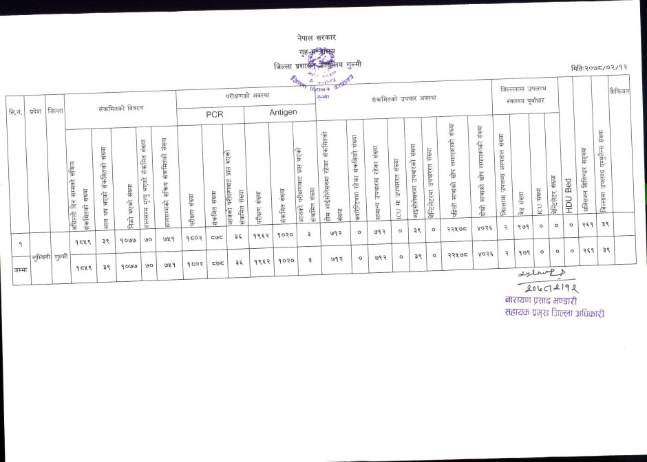 मिति २०७८। ०२।१२ कोभिड-१९ को गुल्मी जिल्लाको संक्षिप्त विवरण ।