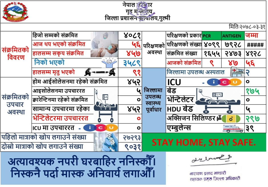 तस्बिर : मिति २०७८।०३।३१ कोभिड-१९ को गुल्मी जिल्लाको संक्षिप्त विवरण ।