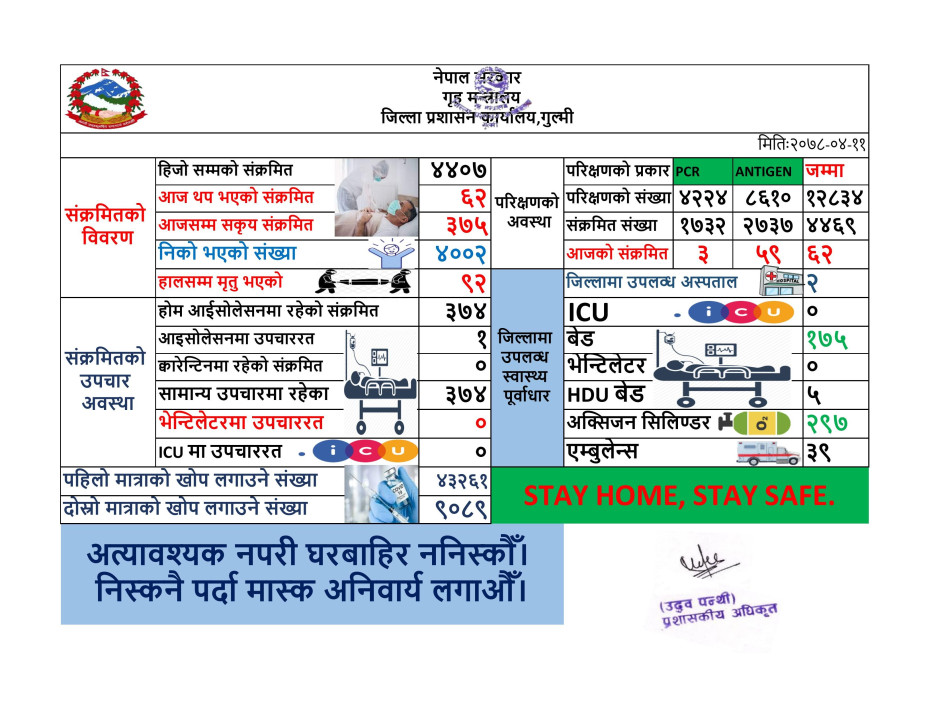 मिति २०७८।०४।११ कोभिड-१९ को गुल्मी जिल्लाको संक्षिप्त विवरण ।