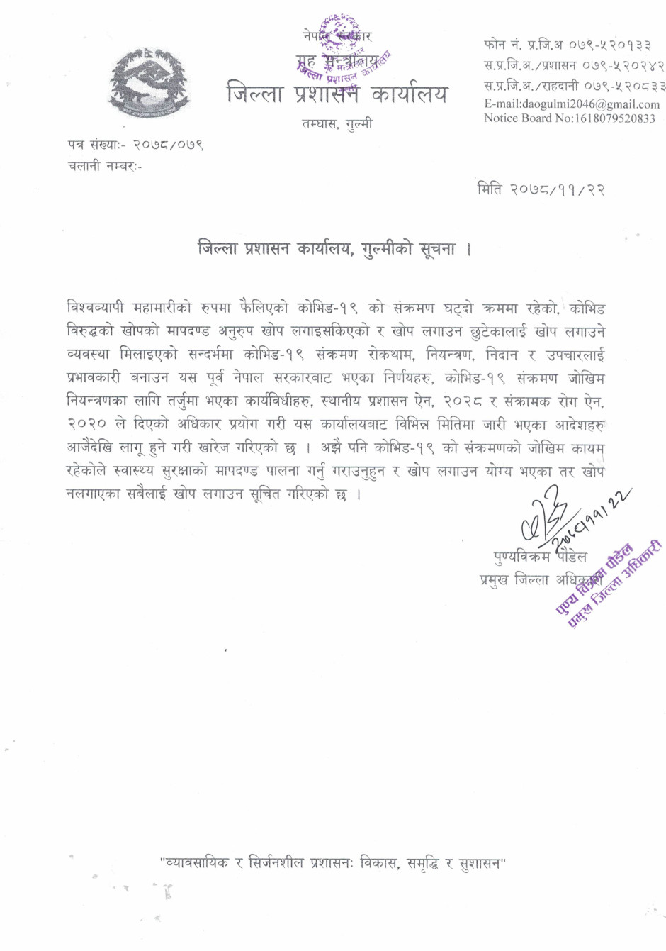 जिल्ला प्रशासन कार्यालय गुल्मीको सूचना ।