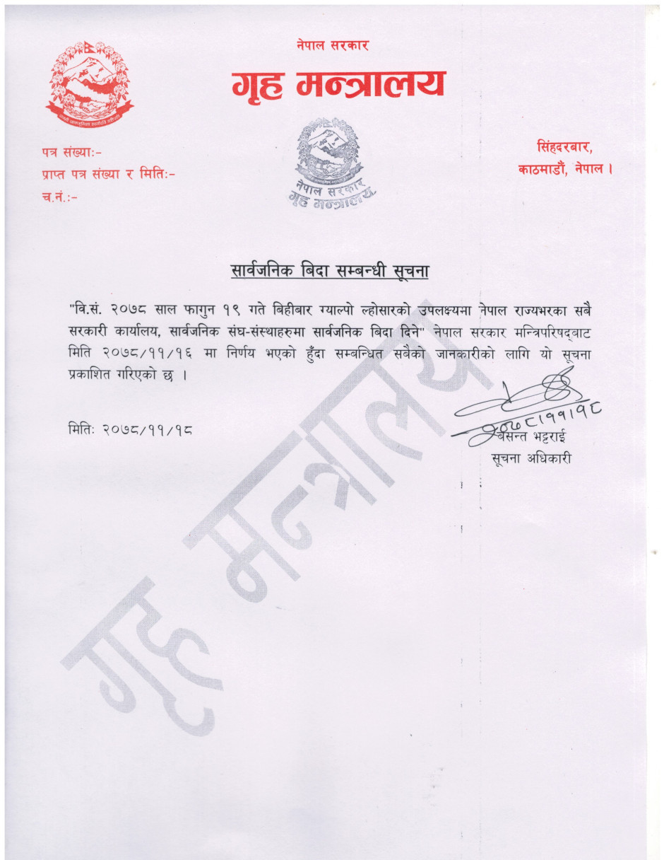 सार्वजनिक विदा सम्बन्धी सूचना ।
