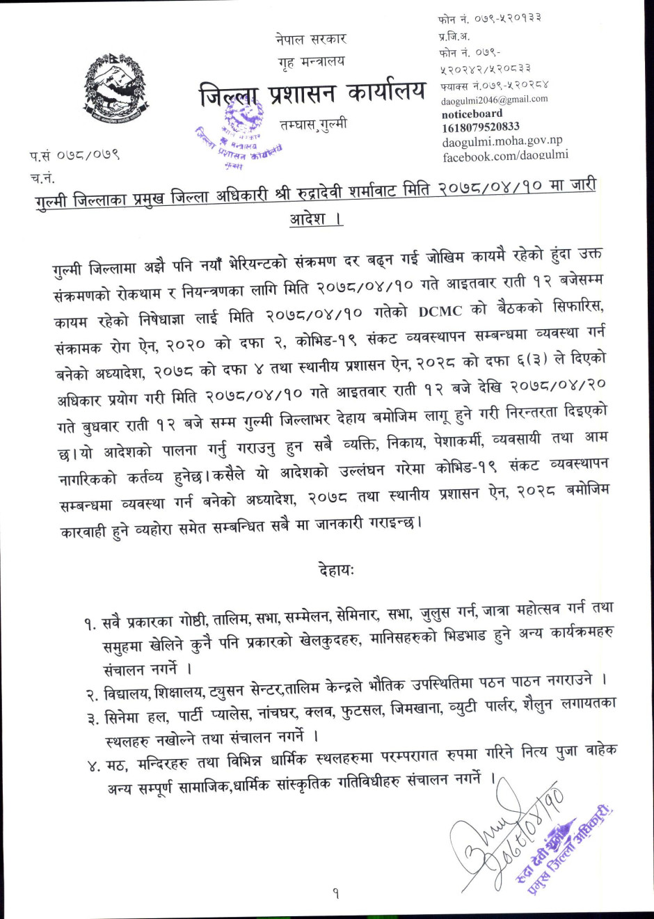 प्रमुख जिल्ला अधिकारी श्री रुद्रादेवी शर्माज्यूबाट मिति २०७८-०४-१० गते जारी भएको आदेश ।