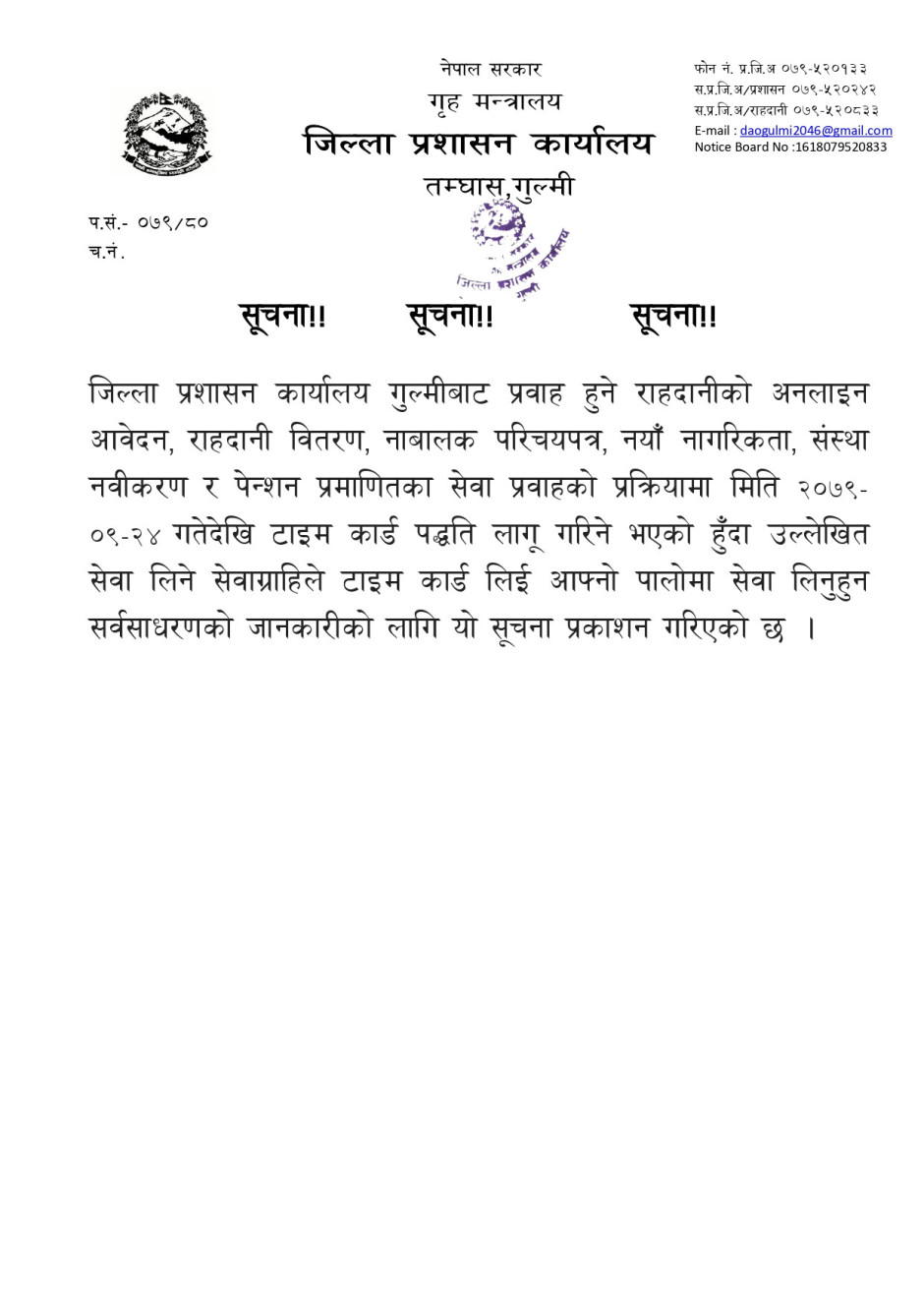 सेवाप्रवाहमा टाइम कार्ड लागु गरिने सम्बन्धी सूचना।