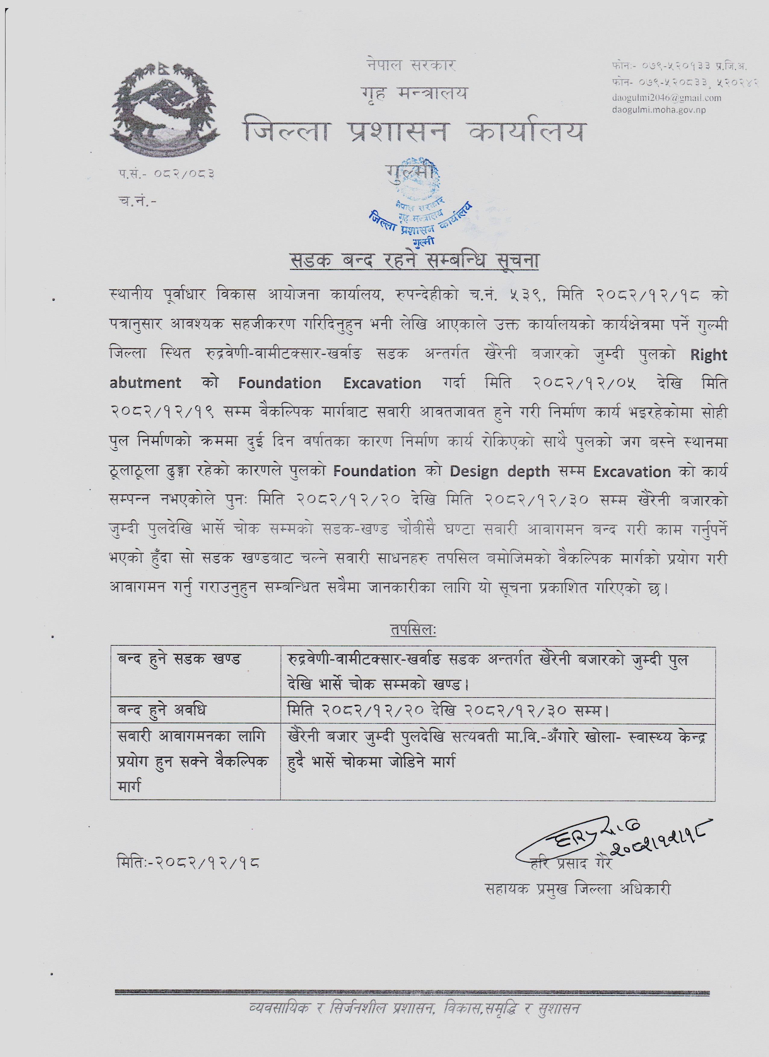 सडक बन्द रहने सम्बन्धि सूचना!