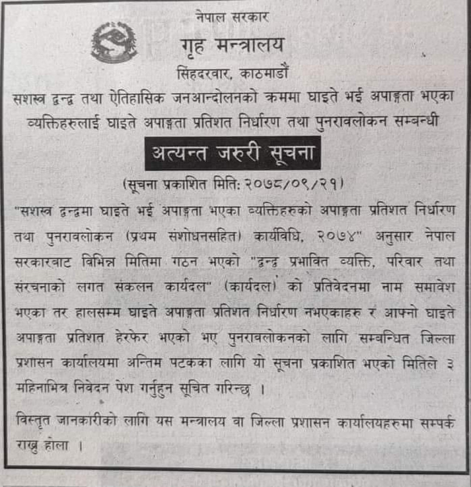 सशस्त्र द्वन्द्व एवं जनआन्दोलनका क्रममा घाईते भई अपाङ्गता भएका व्यक्तिहरुको लागि अत्यन्त जरुरी सूचना ।