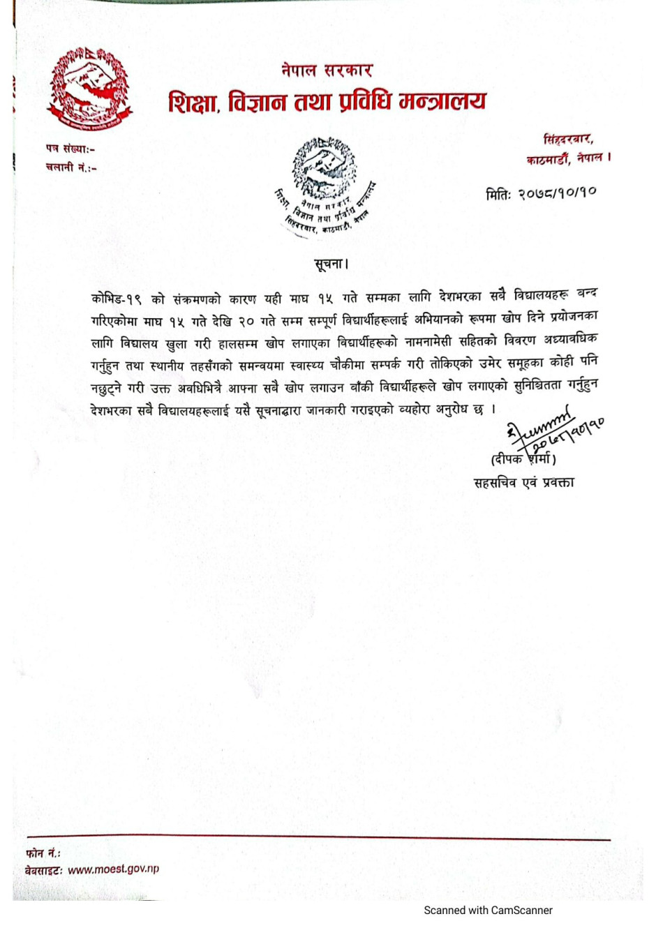 शिक्षा,विज्ञान तथा प्रविधि मन्त्रालयले मिति २०७८/१०/१० गते जारी गरेकाे सूचनामा उल्लेख भए अनुसार माघ १५ गते देखि २० गतेसम्म विद्यालयहरुमा विद्यार्थीहरुले खाेप लगाए नलगाएकाे विवरण अध्यावधिक गर्ने भनी प्रकाशन गरिएको विज्ञप्ति विद्यालय खाेल्नका लागि नभई विवरण अध्यावधिक गर्ने र काेहि कसैले खाेप नलगाएकाे पाइएमा लगाउने व्यवस्था मिलाउनकाे लागि भएकाे हुनाले विद्यालय खाेली पठनपाठन गराउने अनुमति भएकाे अर्थमा नबुझ्नुहुन सम्बन्धित सबैमा जानकारी गराइन्छ ।